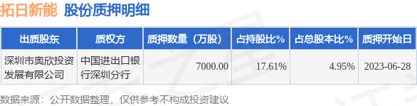 拓日新能(002218)6月30日公开信息显示,股东深圳市奥欣投资发展有限公司向中国进出口银行深圳分行合计质押7000.0万股,占总股本4.95%。质押详情见下表: