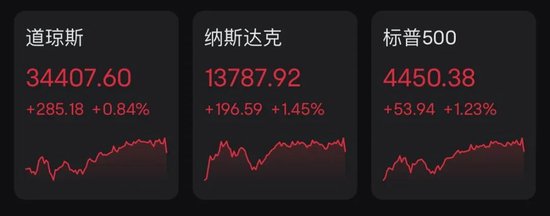 当地时间周五,美股三大指数集体收涨。截至收盘,道指涨超285点,涨幅0.84%,报34407.6点;标普500指数涨近54点,涨幅1.23%,报4450.38点;纳指涨超196点,涨幅1.45%,报13787.92点。本周,道指涨2.02%,标普500指数涨2.35%,纳指涨2.19%。