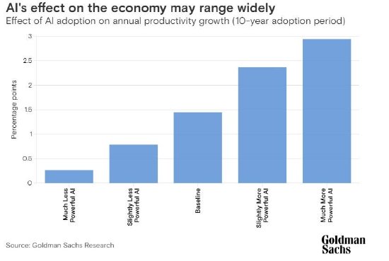 高盛的经济学家团队预计,人工智能的全面采纳和普及可能在10年内每年将生产率提高大约1.5个百分点,因此,高盛预计,未来20年标普500指数每股收益的复合年增长率将为5.4%,而目前他们的股息贴现模型假设的每股收益复合年增长率为4.9%,这意味着标普500指数的公允价值将比现在高出大约9%。