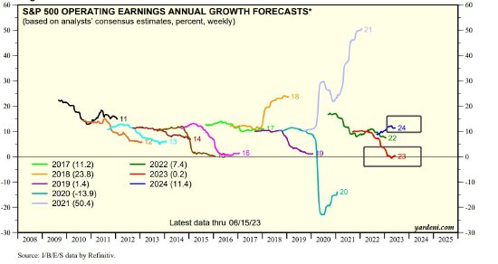 来自投资机构Yardeni的统计数据显示,分析师们普遍预期自今年第三季度开始,标普500指数的整体每股营业利润开始呈现回升态势,并且在第四季度大幅增长。从更长时间线来看,分析师们普遍预期2023年每股营业利润预期已由此前的负值趋于开始缓慢回升,2024年则有望重新实现10%以上高增速。