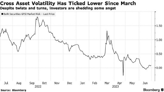 经济繁荣带来的其中一个后果是波动性的减少,而且不仅仅是在股市。美国银行(Bank of America)的一项跨资产风险指标在2023年稳步下降,除了3月份银行业动荡期间出现飙升。 Macro Risk Advisors首席技术策略师John Kolovos表示,隐含波动率的减弱趋势助长了看涨论调。他表示:“我们一直以来对宏观经济的担忧已慢慢消散。”“当一个指标显示宏观不确定性非常低时,这对股市来说是一个巨大的利好。”