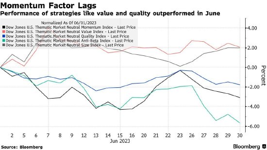 动量因子滞后,表明市场广度大幅改善——价值和质量等策略的表现在6月份优于大盘