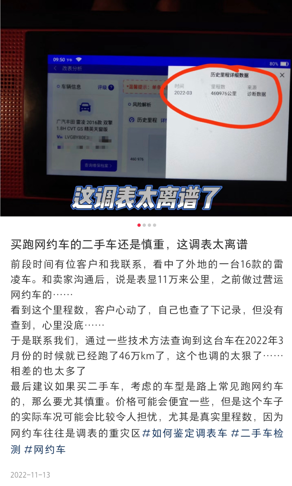 不少卖二手网约车的车主为了高价转手,将车子的四个轮胎全部换掉,假装成一辆九成新的“新车”。更有无良车商甚至把已经开了三四十万公里的车往回调表,粉饰成一辆五六万公里出头的“新新二手车”,坑了不少渴望快速成为有车一族的“准车主”。