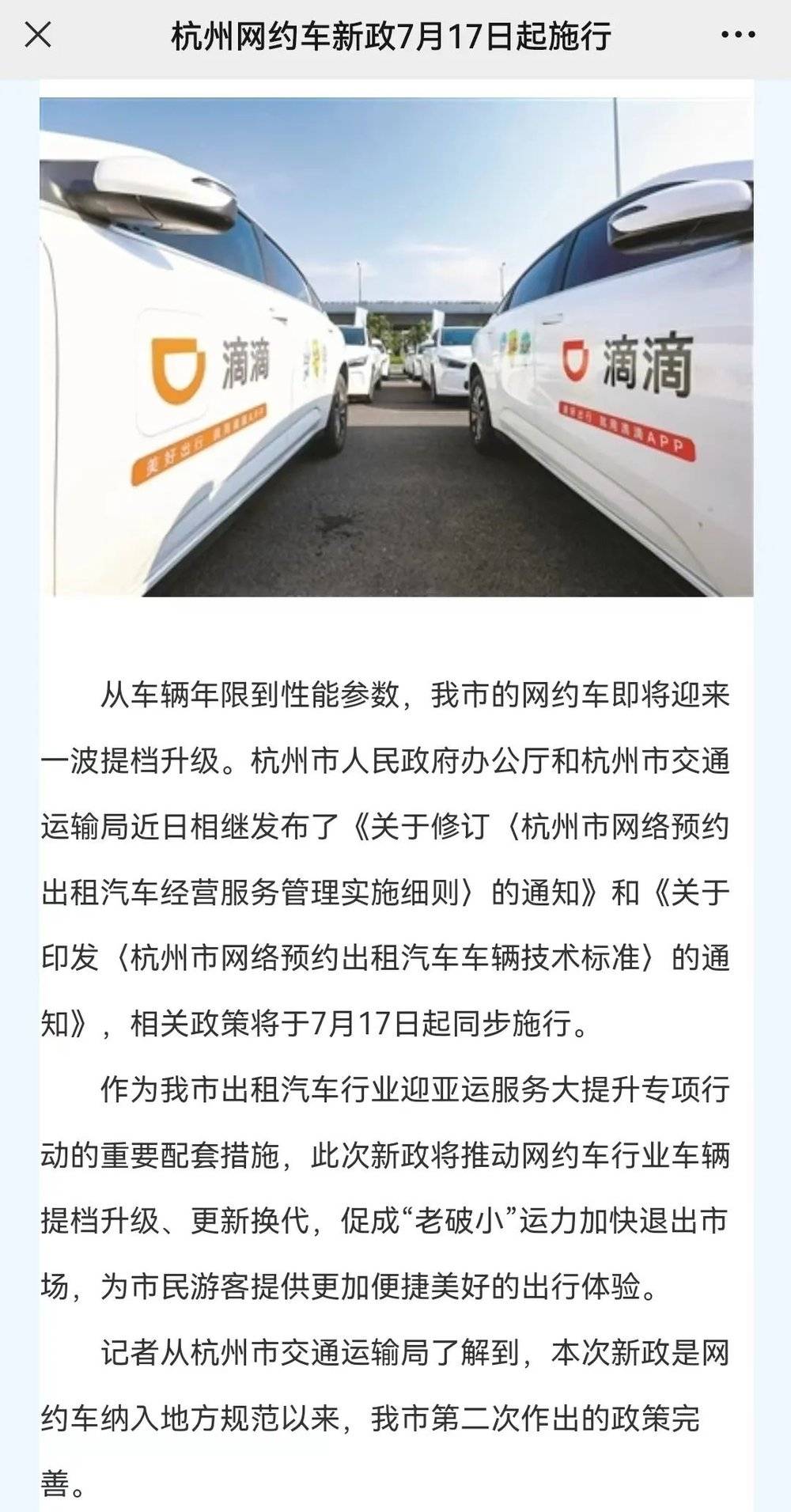 6月25日,杭州市交通运输局发布《杭州市网络预约出租汽车车辆技术标准》,这份将于7月17日落地实施的“网约车新政”,在从业标准上提出了诸多门槛。
