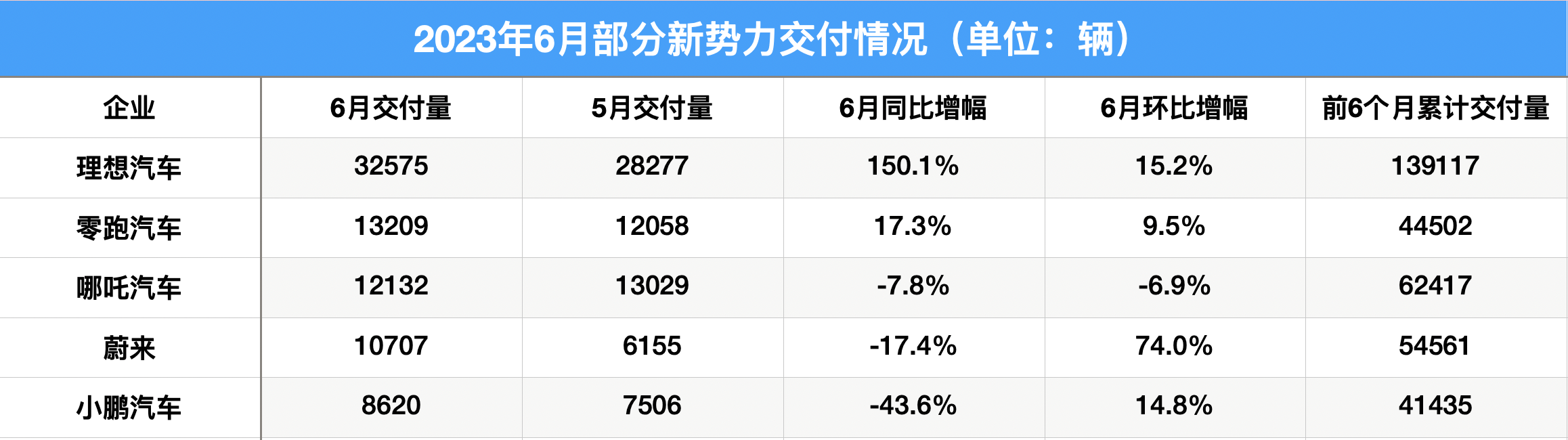 造车新势力方面,理想汽车依旧保持强劲势头,其仍位列当月造车新势力新车交付榜第一位,并再次创下理想汽车单月交付的新纪录。6月,理想汽车共交付新车约3.26万辆,月度交付量首次突破三万,同比增长150.1%。