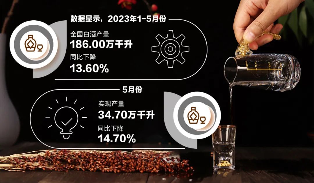 数据显示,2023年1-5月,全国白酒产量186.00万千升,同比下降13.60%,其中5月份实现产量34.70万千升,同比下降14.70%。