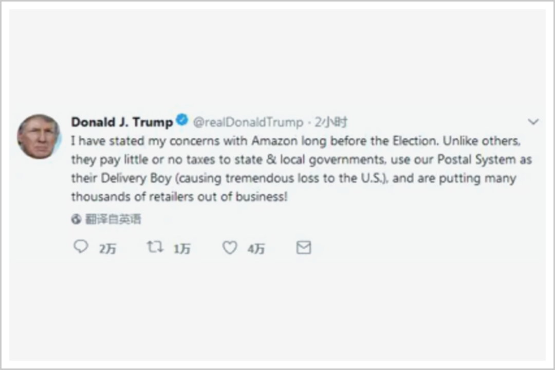在他看来,亚马逊损害了零售商,害得美国人的工作都没有了。