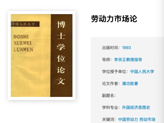 1993年潘功胜提交了博士论文,题为《劳动力市场论》。文章称,中国经济体制改革是一个不断注入市场成份的过程,然而在整个市场体系的发展中,劳动力市场的发育严重滞后。这不仅制约了整个市场体系的进一步发育,而且也是整个经济体制改革进一步向前推进的“瓶颈”。展开对劳动力市场理论和政策的研究,不仅是一个重要的理论课题,而且是来自实践的迫切呼唤。本文试图以中国的实践为基点,以发达的西方劳动力市场为参照系,对劳动力市场的运作进行全面而系统地分析,实证研究中国劳动力市场的发育问题。
