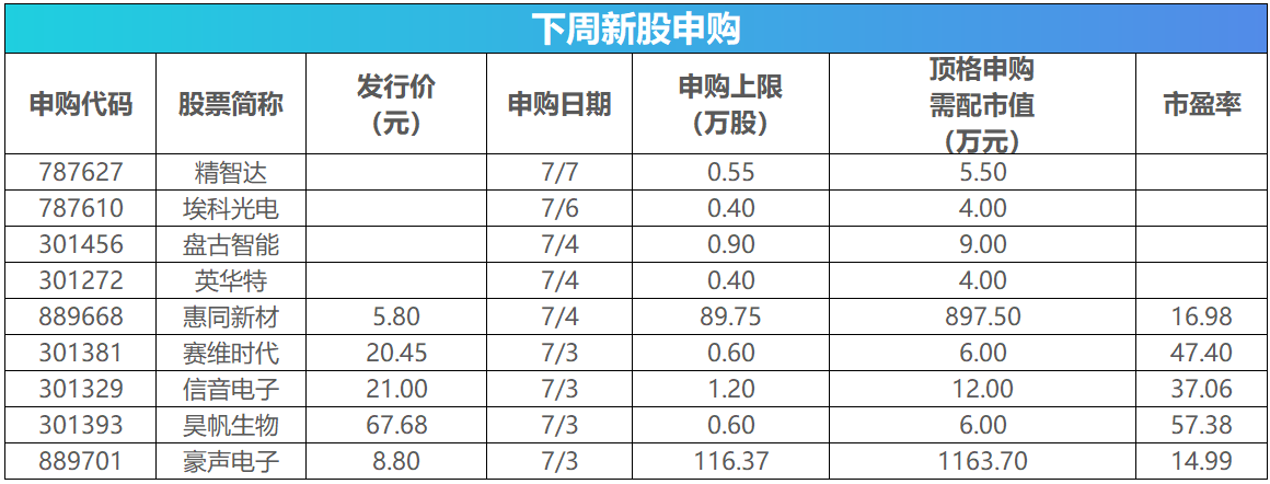 下周A股将有9只新股网上发行。其中,7月3日发行的是信音电子、昊帆生物、赛维时代、豪声电子;7月4日发行的是英华特、盘古智能、惠同新材;7月6日发行的是埃科光电;7月7日发行的是精智达。