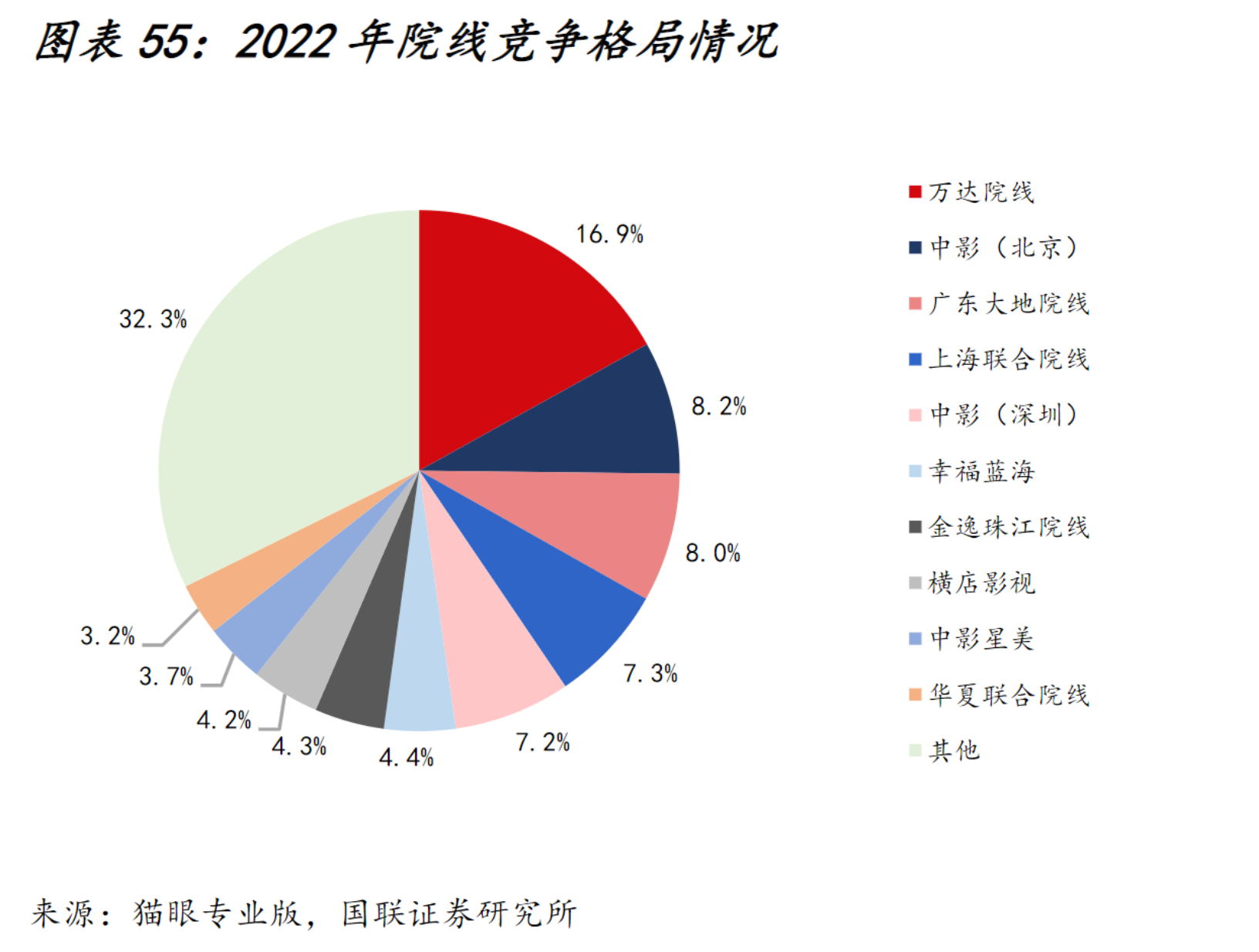 从竞争格局来看,万达电影在影投和院线市占率均维持行业第一。影投方面,横店影视、金逸影视、博纳影投、中国电影和幸福蓝海等次之。院线方面,中国电影、幸福蓝海和横店影视等次之。