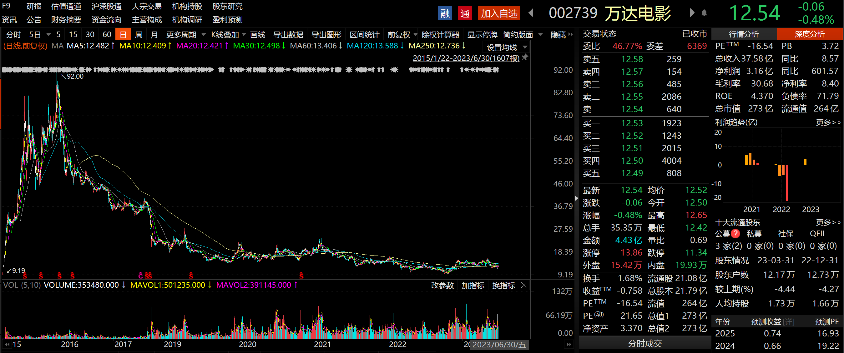 万达电影股价自2015年底历史最高点一路下探,累计最大跌幅超8成,2019年迄今长期横盘。业内人士表示,依赖节假日造成头部效应明显,平日票房进一步萎缩。今年春节档创造了历史第二高的票房成绩,但从3月1日至五一档开始前,大盘票房不足40亿,相较2019年同期60-80亿的水平有明显差距。此外,观影人数变少,需求端仍未恢复。
