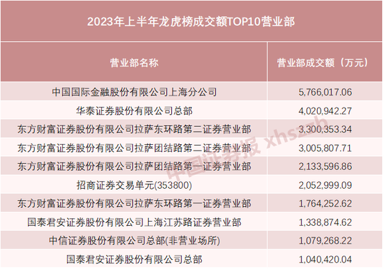 上半年,中金公司上海分公司龙虎榜成交额为576.6亿元,居首位;华泰证券总部的成交额为402.1亿元,排名第二;排名第三的是东方财富证券拉萨东环路第二证券营业部,成交330.04亿元。