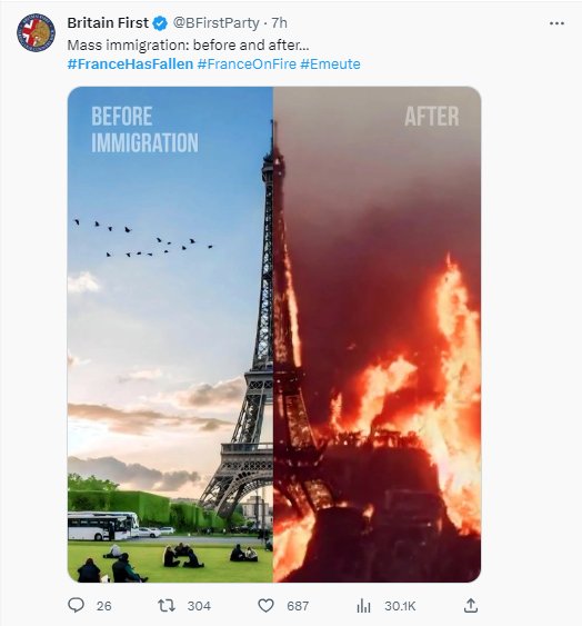 同日,推特账号“英国优先党”发图,展示法国允许大规模移民入境前后的对比画面。这张图左边显示法国允许大规模移民入境前巴黎埃菲尔铁塔所处地带在晴空下的画面,右边显示法国允许大规模移民入境后埃菲尔铁塔所处地带烈火燃烧的画面。↓
