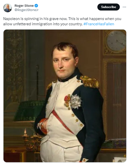 特朗普前政治顾问罗杰·斯通当地时间7月1日在推特上发帖时,也使用了#法国陷落#标签。他在帖子中称,“拿破仑都会在坟墓里翻身。当你们允许移民不受限制地前往你们国家时,就会发生这种情况”。↓