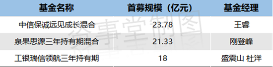 据Choice数据统计,近两月首募规模前三甲的基金中,有两只基金的首募规模超过20亿元,分别是中信保诚远见成长混合和泉果思源三年持有期混合。