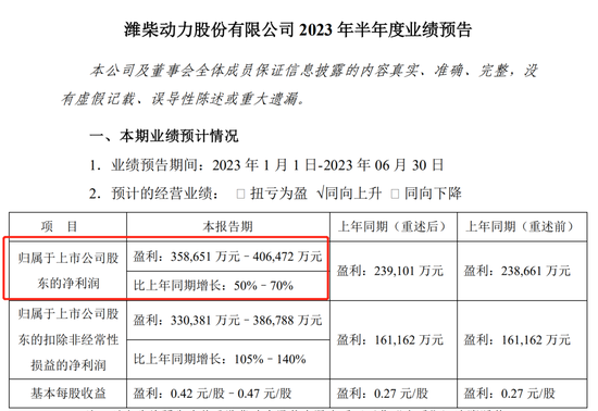 潍柴动力的2023年半年度业绩预告显示,公司净利润预计为35.87亿元–40.65亿元,预计同比增长50%–70%。