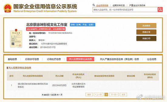 信息显示,6月28日,北京市通州区市场监督管理局因“通过登记的住所或者经营场所无法联系”,将北京蔡徐坤影视文化工作室列入经营异常名录。