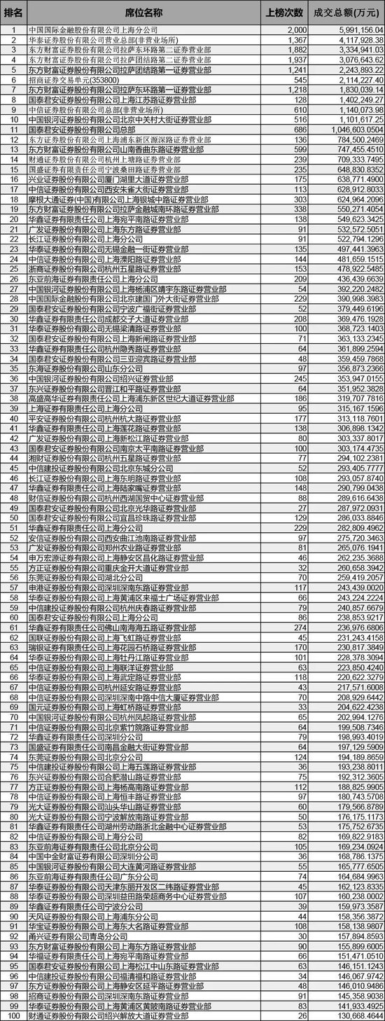 值得注意的是,包括上半年登顶的中金公司上海分公司,以及同样跻身前十的华泰证券营业总部(非营业场所)、招商证券交易单元(353800)、中信证券总部(非营业场所),“分公司”“营业总部”“交易单元”在龙虎榜中渐渐占据了举足轻重的地位。