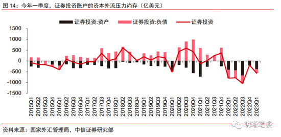 金融账户:资本外流压力尚存,但较去年有所收敛。2023年一季度,我国“非储备性质的金融账户”逆差规模继续走阔,储备资产小幅增加。其中,对外直接投资规模增长,但外商来华直接投资规模边际回落,导致直接投资项逆差走阔,预计后续将吸引外商投资的重要性不断提升;受制于中美10年期国债利差深度倒挂,证券投资账户的资本外流压力主要集中于债市,国际收支中的“证券投资:负债:股权”顺差规模实现环比增长,一定程度对冲了债券市场的外资流出压力;其他投资账户录得较大规模顺差,有效对冲部分渠道的资金流出压力。