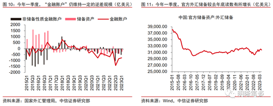 2023年一季度,我国“非储备性质的金融账户”逆差规模继续走阔,储备资产小幅增加。具体来看,今年一季度“非储备性质的金融账户”逆差规模达508亿美元,较去年四季度规模环比走阔,其中直接投资和证券投资账户均录得不同程度的逆差。储备资产方面,整个一季度,国际收支维度的储备资产增加255亿美元,其中黄金储备增加35亿美元,外汇储备增加206亿美元;从央行公布的官方外汇储备余额口径来看,截至今年3月,官方外汇储备余额录得31838亿美元,较2022年12月读数增加561.8亿美元,主要原因为汇率折算等非交易因素的影响。