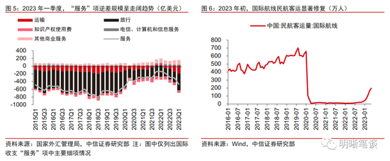 “服务”项逆差规模呈走阔趋势,其中旅游逆差规模的增长是主要原因。运输服务方面,运输收入的回落导致“运输”项逆差规模增长;相较于其他项目而言,规模庞大的“旅行”项在影响我国“服务”项数据的表现中占主导地位。随着2022年末“乙类乙管”方案出台、中外人员往来管理优化,2023年初国际道路客运服务优化,文旅部有序恢复出境团队旅游和“机票+酒店”业务以及部分国家先后放宽对我国入境人员的新冠防疫措施等一系列利好政策落地,为出境旅游在客观条件方面提供了重大便利,今年一季度,我国国际航线的民航客运量显著回升。在此背景下,“旅行”服务逆差规模进一步增长,成为服务逆差规模走阔的主要原因。往后看,在政策助力叠加居民内在需求回升作用下,2023年出境活动有望持续回暖,服务逆差或延续扩大趋势。