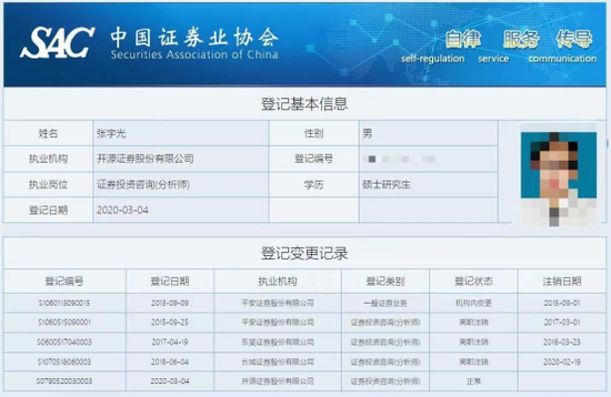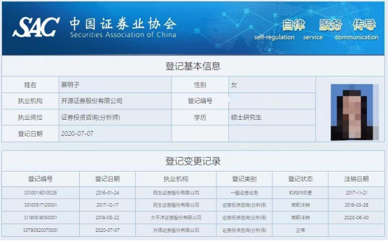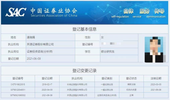 中国证券业协会网站证券从业人员信息公示显示,张宇光、逄晓娟、蔡明子3人最新的执业机构均为开源证券股份有限公司,登记类别为证券投资咨询(分析师),登记状态为正常。