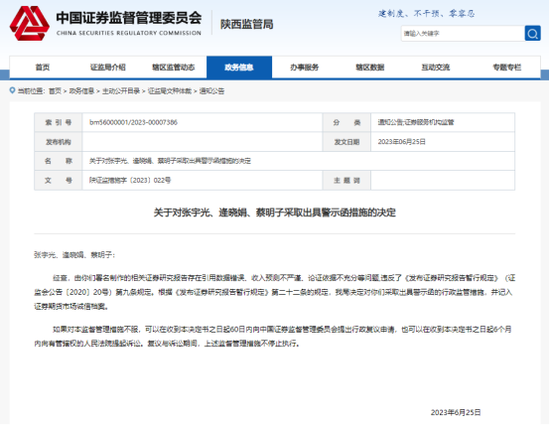 警示函显示,经查,由张宇光、逄晓娟、蔡明子署名制作的相关证券研究报告存在引用数据错误、收入预测不严谨、论证依据不充分等问题,违反了《发布证券研究报告暂行规定》(证监会公告〔2020〕20号)第九条规定。根据《发布证券研究报告暂行规定》第二十二条的规定,中国证监会陕西监管局决定对张宇光、逄晓娟、蔡明子3人采取出具警示函的行政监管措施,并记入证券期货市场诚信档案。