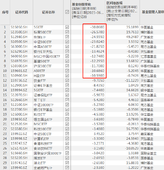 份额缩水的产品中,华夏5GETF份额减少30亿份,博时标普500ETF缩水26亿份,传媒ETF份额缩水24亿份,南方中证500ETF份额缩水21.8亿份。