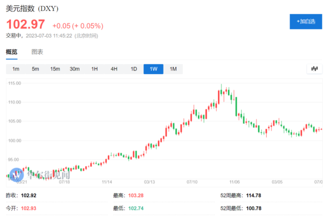 自去年9月份见顶以来,美元一直处于下跌趋势。在今年前六个月中,美元指数有四个月下跌。市场普遍认为,随着美联储加息接近尾声,美国和其他发达市场的利差收窄,美元恐将进一步下行。