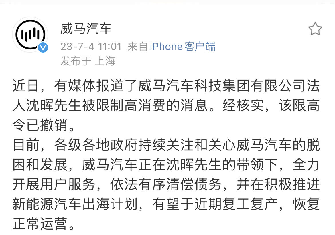 据威马汽车官微消息,近日,有媒体报道了威马汽车科技集团有限公司法人沈晖被限制高消费的消息。经核实,该限高令已撤销。
