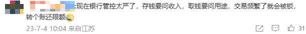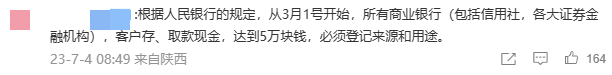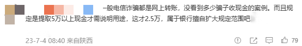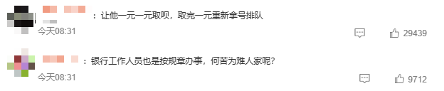 也有网友指出,按照银行规定,从3月1日起,个人到银行存取款超过5万元时要进行相关登记。视频中该男子取款金额只有2.5万元,银行工作人员进行询问的行为并不合适。