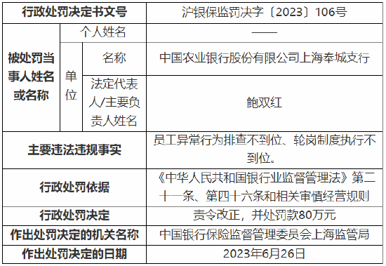员工异常行为排查不到位等 农行一支行被罚80万元 admin 2023-07-04 10 默认 摘要: 7月4日金融一线消息,据国家金融监督管理总局网站发布的行政处罚信息公开表显示,农业银行上海奉城支行因员工异常行为排查不到位、轮岗制度执行不到位,被监管责令改正,并处罚款80万元... 7月4日金融一线消息,据国家金融监督管理总局网站发布的行政处罚信息公开表显示,农业银行上海奉城支行因员工异常行为排查不到位、轮岗制度执行不到位,被监管责令改正,并处罚款80万元。同时,张玲红对该行员工异常行为排查不到位负有直接责任,被监管警告。 阅读 上一篇1次取1元逼哭银行工作人员,你怎么看? 下一篇西安魅力金蒂场所招聘-只为自己选择没错 1次取1元逼哭银行工作人员,你怎么看?上一篇 西安魅力金蒂场所招聘-只为自己选择没错下一篇 相关推荐 三亚酒吧招聘33号会所场所招聘骗局秘密陷进少走十年弯路 2025-10-20 三亚酒吧招聘朗庭会女员工特-高工资的商务素场 2025-10-20 十大深圳中高端ktv丨订房那个好玩 2025-10-20 深圳夜总会订房.价格明细表-深圳夜场KTV预订信息 2025-10-20 西安top.1KTV排名大全预订包厢不去后悔 2025-10-20 三亚酒吧招聘汗彩盛世场所招聘骗局秘密陷进少走十年弯路 2025-10-20