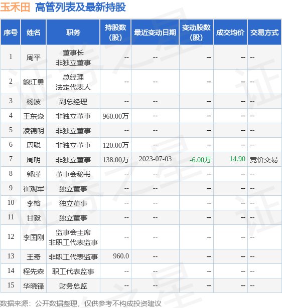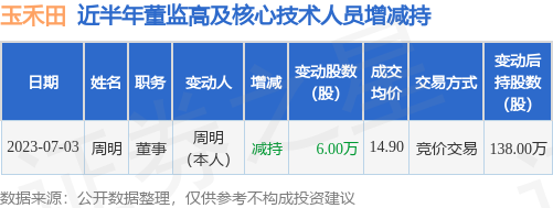 玉禾田近半年内的董监高及核心技术人员增减持详情如下: