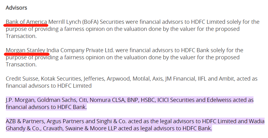 知情人士表示,这次交易的佣金池“不成比例得小”,主要原因是由HDFC董事长迪帕克·帕勒克领衔的管理团队,推动了整个合并的进程,这些投行顾问起到的作用非常有限。摩根士丹利和美银拿大头的原因,是因为他们在交易过程中提供了估值方面的意见。其他许多投行根本就没有起到什么作用,有些甚至是交易官宣前一天,才刚刚知道有这么一回事。