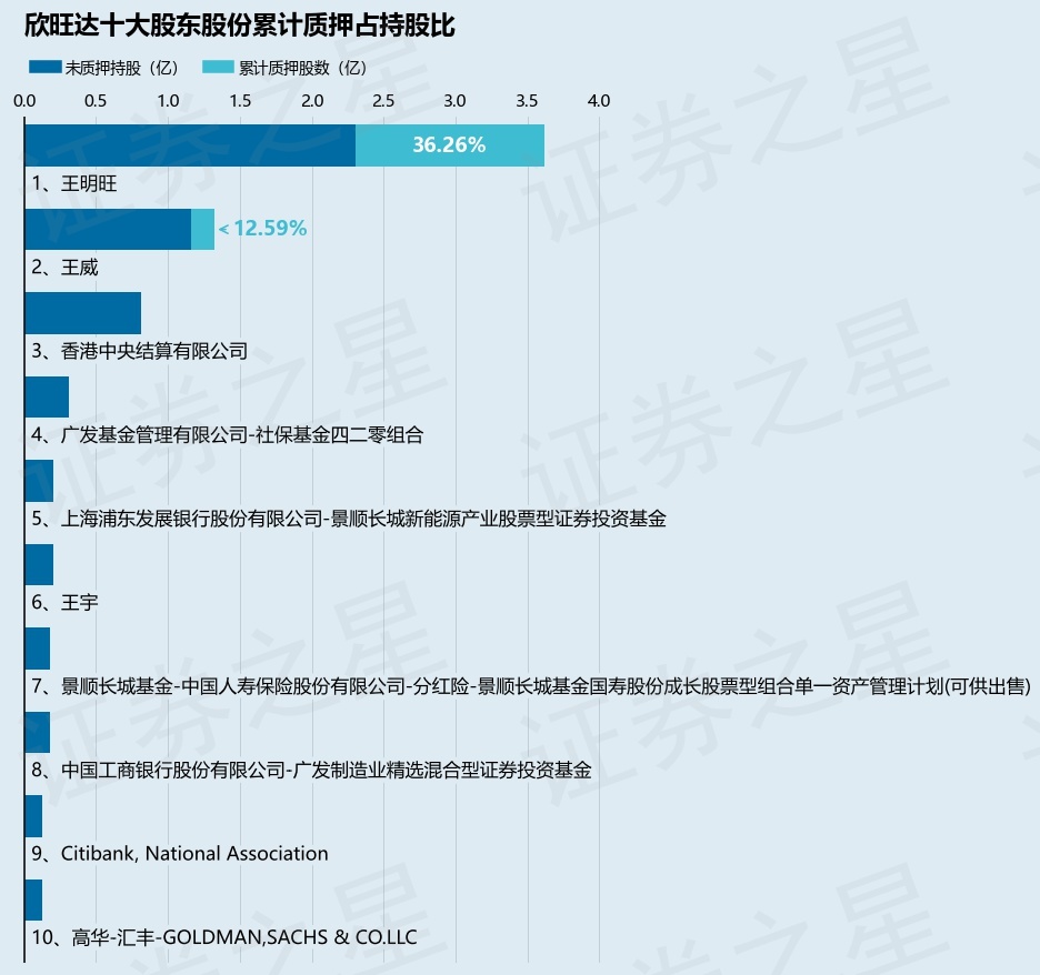 截止本公告日,股东王明旺已累计质押股份1.31亿股,占其持股总数的36.26%,股东王威已累计质押股份1668.0万股,占其持股总数的12.59%。本次质押后欣旺达十大股东的累计质押股份占持股比例见下图: