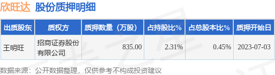 欣旺达(300207)7月4日公开信息显示,股东王明旺向招商证券股份有限公司合计质押835.0万股,占总股本0.45%。质押详情见下表: