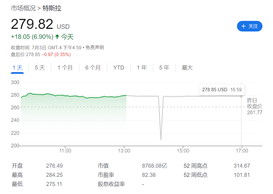 乔纳斯对特斯拉的评级为“持有”,目标价为250美元,较特斯拉最新收盘价低约10%。周一,特斯拉股价在常规交易时段上涨6.9%,收于279.82美元。