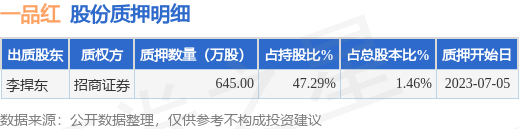 一品红(300723)7月5日公开信息显示,股东李捍东向招商证券合计质押645.0万股,占总股本1.46%。质押详情见下表: