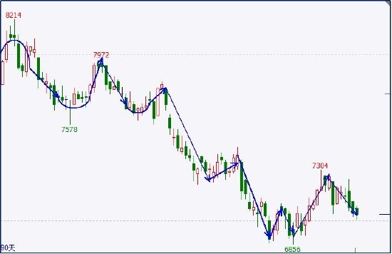 今日硅铁主力合约小幅收跌。早盘开盘硅铁出现跳空高开,盘中上涨动力不足盘中大幅下挫,午后价格止跌企稳,呈现小幅上涨,全天维持宽幅区间震荡结构,尾盘收跌于0.34%,全天价格流畅度较差。从硅铁周期形态看属于震荡中的下跌。继今年上半年硅铁走出一波顺畅的下跌周期后,进入六月价格止跌出现小周期反弹,近一周空头卷土重来,三连阴后市场再度回归下跌周期,短期关注再次下破支撑位。