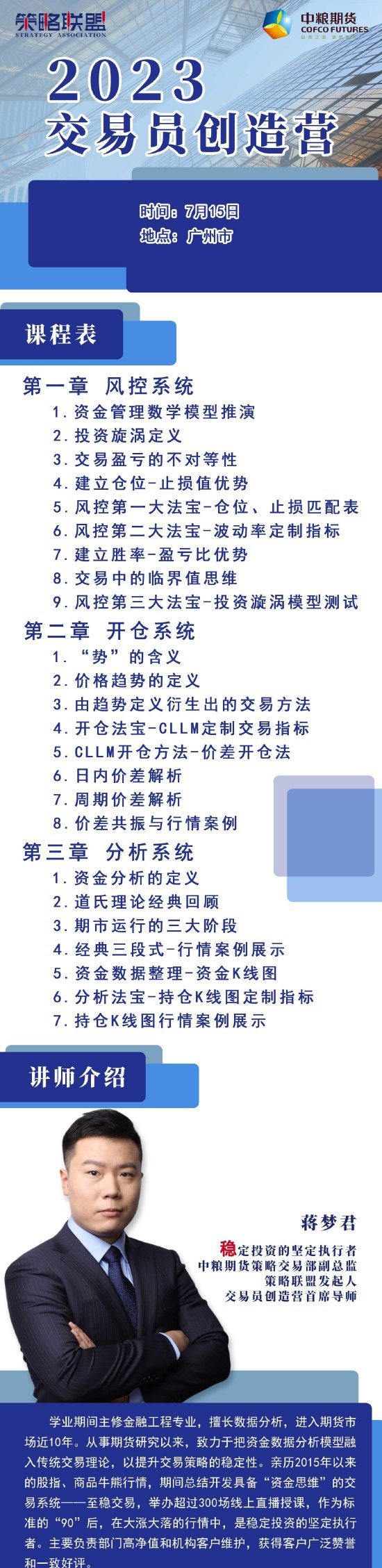 中粮期货总部策略交易部 即将举办线下交易培训课《交易员创造营》,涵盖资金管理数学模型、正向交易思维、三段论结构、价差开仓策略等核心内容,更有策略联盟独家技术法宝:⭐个性化交易指标定制、⭐风控参数定制。报名方式电话:18610141527