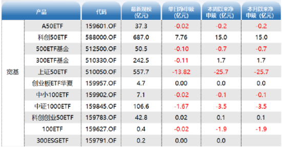华夏ETF产品方面,除了科创50ETF、科创创业50ETF,其余规模型宽基净流出居多。大盘风格的上证50ETF单日净流出-13.82亿元,紧随其后的是中小盘风格的中证1000ETF,净流出-1.67亿元。