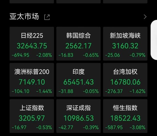 不过,受美联储利空消息影响,亚太主要股市早盘全线下跌,日经225指数跌超2%;韩国综指跌0.65%;澳洲标普200指数跌1.44%,台湾加权跌1.62%。