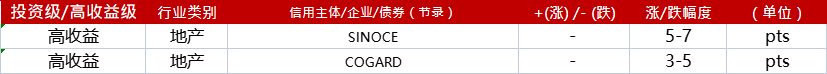 二级市场方面,整体较为疲弱,国企板块方面, 中化走宽3-4bps;科技板块方面,腾讯、美团走宽2-3bps;金融板块方面,AMC板块较为安静,T2以及租赁板块有买家支撑,国银金租在前日大幅走宽后昨日有所企稳,AT1交投活跃 ;城投板块小幅走弱;地产板块方面,受远洋负面新闻影响,继续维持疲弱,远洋走弱5-7pts,碧桂园跟跌3-5pts,新城、路劲等名字继续下跌1-3pts。