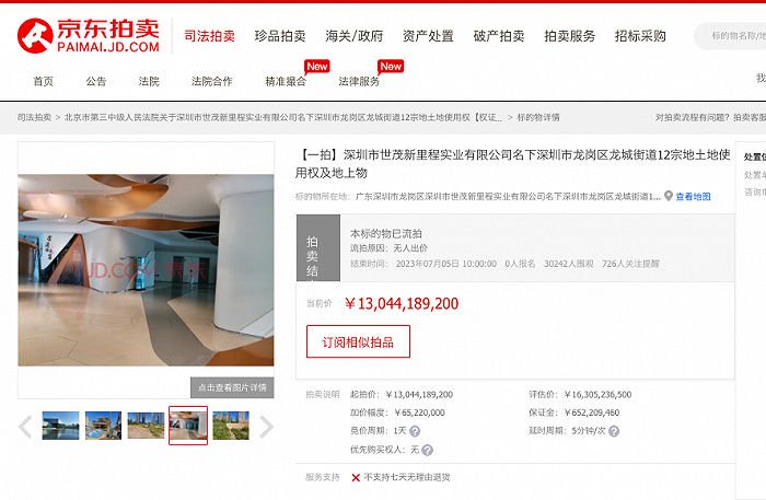 7月5日,京东法拍信息显示,世茂深港国际中心项目首轮司法拍卖结束,该项目因无人出价宣告流拍。