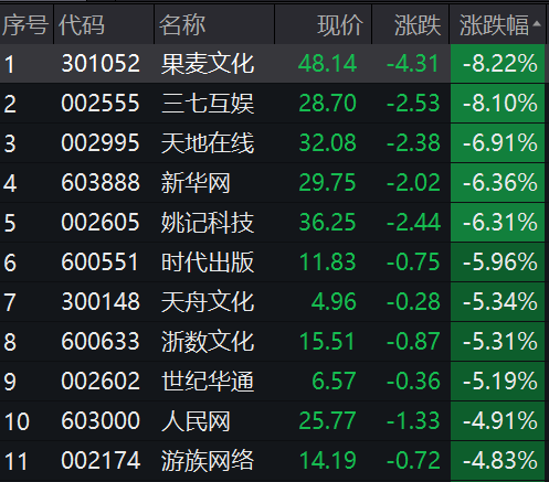 与AI算力同步走低的是传媒板块,上午板块大跌3%,总市值跌至1.6万亿。三七互娱(维权)大跌超8%,天地在线、时代出版、姚记科技、浙数文化等跌幅均超5%。