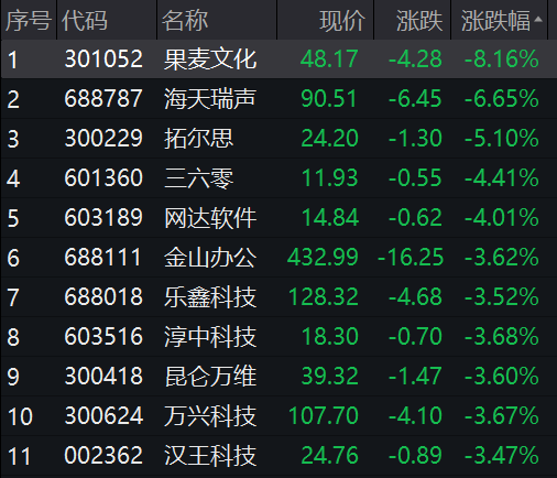 个股方面,果麦文化盘中跌幅近10%,海天瑞声、拓尔思、三六零、万兴科技、昆仑万维、科大讯飞等先后跳水。