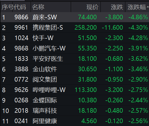 港股早间同样低开:恒指跌0.53%,恒生国企跌0.63%,恒生科技跌0.84%。开盘后港股市场震荡走低,恒生科技跌超2%。蔚来大跌5%,携程、快手、小鹏跌幅居前。