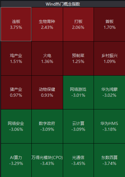 盘面上,电力股早间走高,种业股盘中拉升;AI算力遭遇资金大撤退,光模块、云计算、网络安全等概念接连走低。