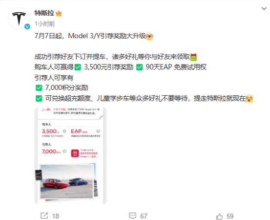 7月7日上午,特斯拉官方微博宣布,7月7日起升级Model3/Y引荐奖励。成功引荐好友下订并提车,购车人可赢得3500元引荐奖励。