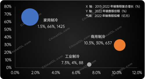 由于制冷设备行业品类众多,且分属产业不同,所以在发展中体现了不同的特点。从2013-2022年长周期来看,家用、商用以及工业制冷设备都实现了不同程度的增长,其中商用制冷成长性最高,复合增长高达10.3%,其次是工业制冷复合增长率为7.3%,家用制冷市场相对比较平稳。